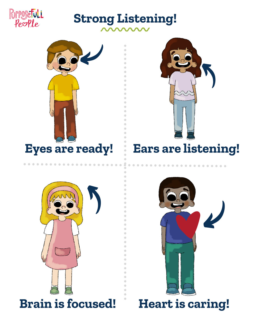 Let's put a circle or a heart next to their listening eyes, ears, brain, and heart.